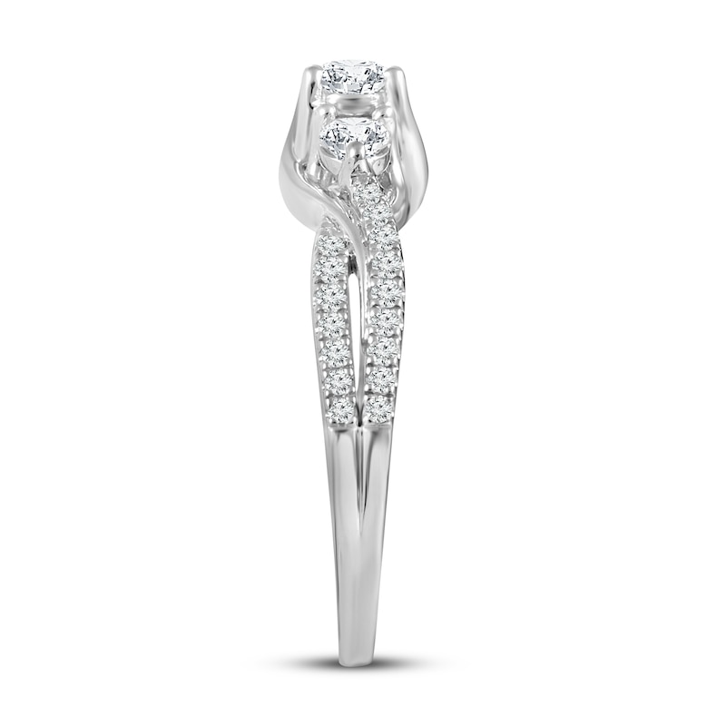 Classic and on-trend, this beautiful 3-stone diamond engagement ring will make her heart melt. Three large round diamonds shine bright as smaller round diamonds crisscross the length of the band, giving the ring a total diamond weight of 3/4 carat. Fashioned in 10K white gold, the ring is featured in the Now & Forever® bridal collection. Available online while supplies last. Previously Owned Treasures are not eligible for in-store pick-up. Previously Owned Treasures may only be shipped either to your home address or to an alternate address. Price comparison based on new item pricing.