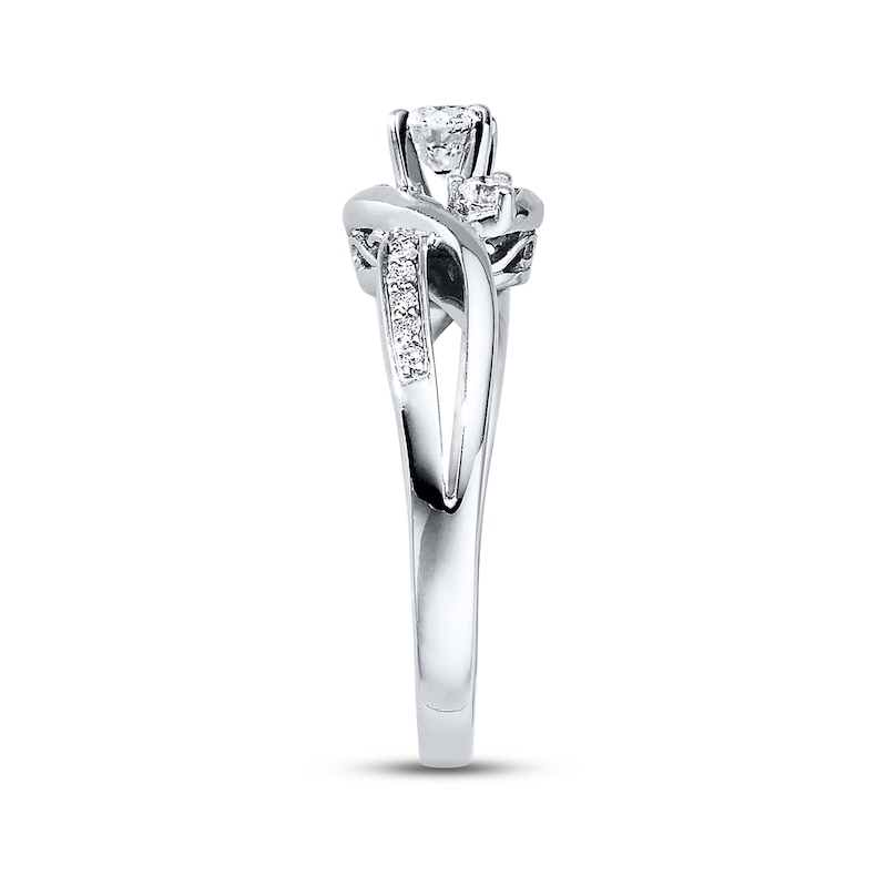 Three stunning round diamonds are embraced by sweeps of 14K white gold in this splendid engagement ring for her. Ribbons of additional round diamonds and 14K white gold flow along the band to complete the look. The ring has a total diamond weight of 3/8 carat. Available online while supplies last. Previously Owned Treasures are not eligible for in-store pickup. Previously Owned Treasures may only be shipped either to your home address or to an alternate address. Price comparison based on new item pricing.