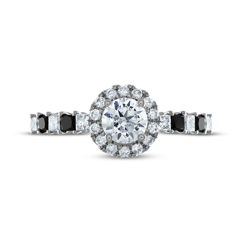 Amaze and delight your bride-to-be with this unique engagement ring. The style showcases a 1/2-carat round-cut diamond wrapped in a halo frame of smaller round diamonds. The shank glimmers with alternating black and white princess-cut diamonds. Crafted in 14K white gold, this fashion-forward ring has a total diamond weight of 1 carat. From the Now & Forever® bridal collection.