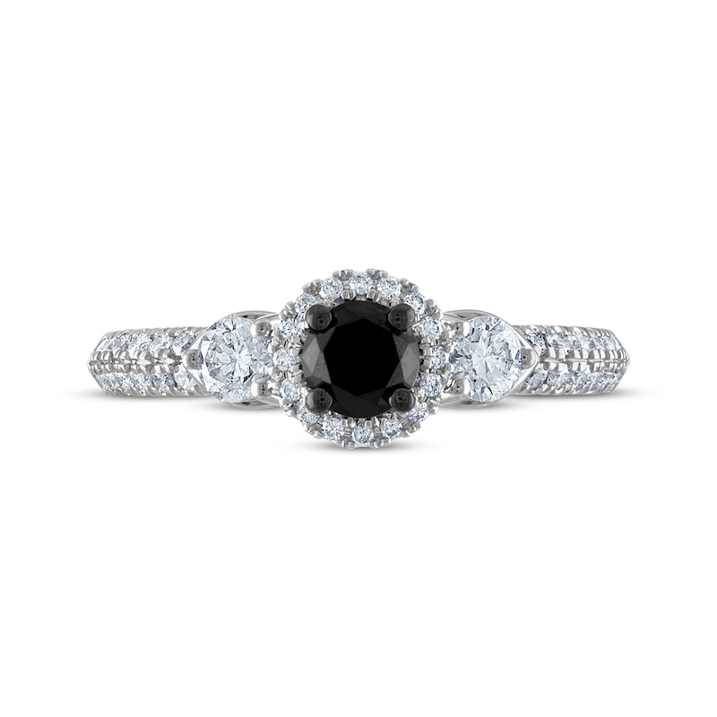 - Round-Cut Black & White Diamond Three-Stone Halo Engagement Ring 1 ct tw White Gold Plated