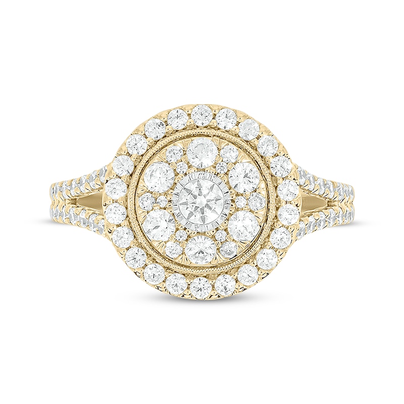 Let your love shine with the stunning look of this engagement ring. Fashioned in 14K yellow gold, the shimmering round-cut diamond center is artfully set to enhance size and sparkle. A double halo of round diamonds in varied sizes and milgrain detailing highlight the centerpiece. Additional round diamonds shine along the split shank for a total diamond weight of 1 carat. From the Now & Forever® bridal collection.