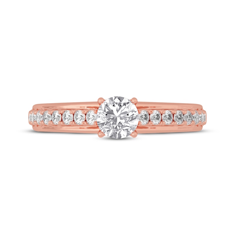Celebrate your engagement with this delightful ring. Crafted in 14K rose gold, this design showcases a shimmering 1/2-carat round-cut diamond solitaire that sparkles atop a sculpted shank lined with smaller round-cut diamonds for a total diamond weight of 3/4 carat. From the Now & Forever® bridal collection.