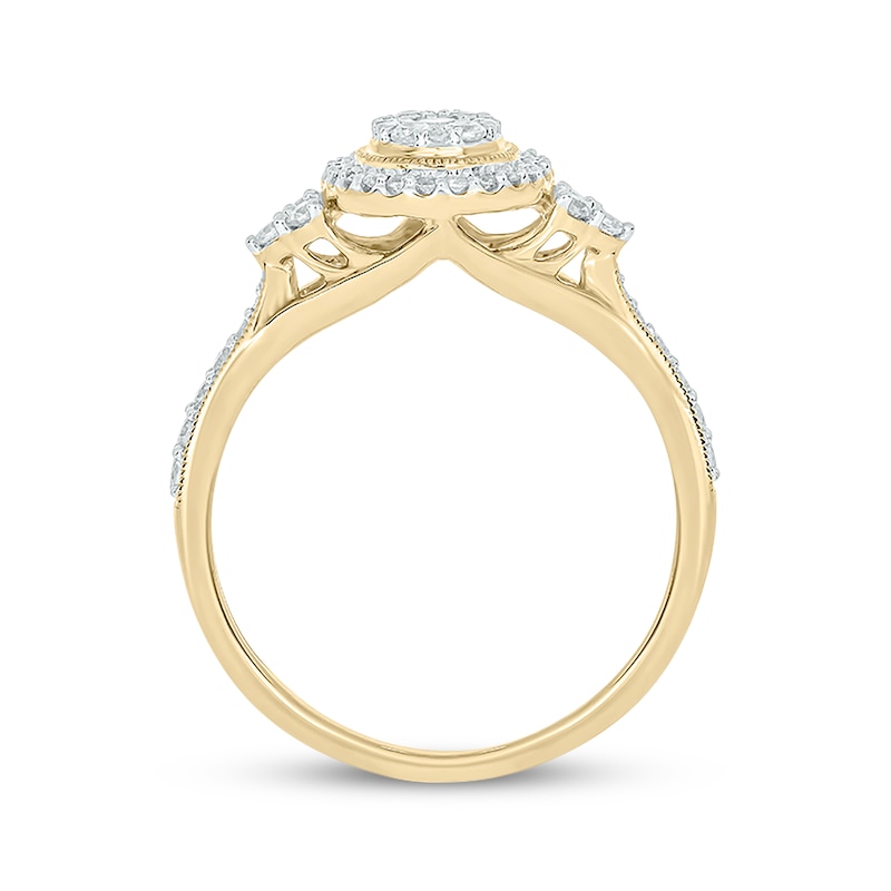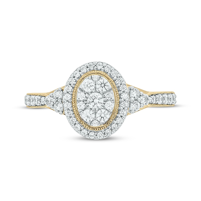 Make a stunning statement with this striking engagement ring. Created in 14K yellow gold with white rhodium details, the design showcases an oval-shaped composite of round-cut diamonds embraced by a milgrain frame. Trios of round diamonds flank the centerpiece, while more glistening round diamonds line the milgrain-detailed shank. The ring has a total diamond weight of 1/2 carat. From the Now & Forever® bridal collection.