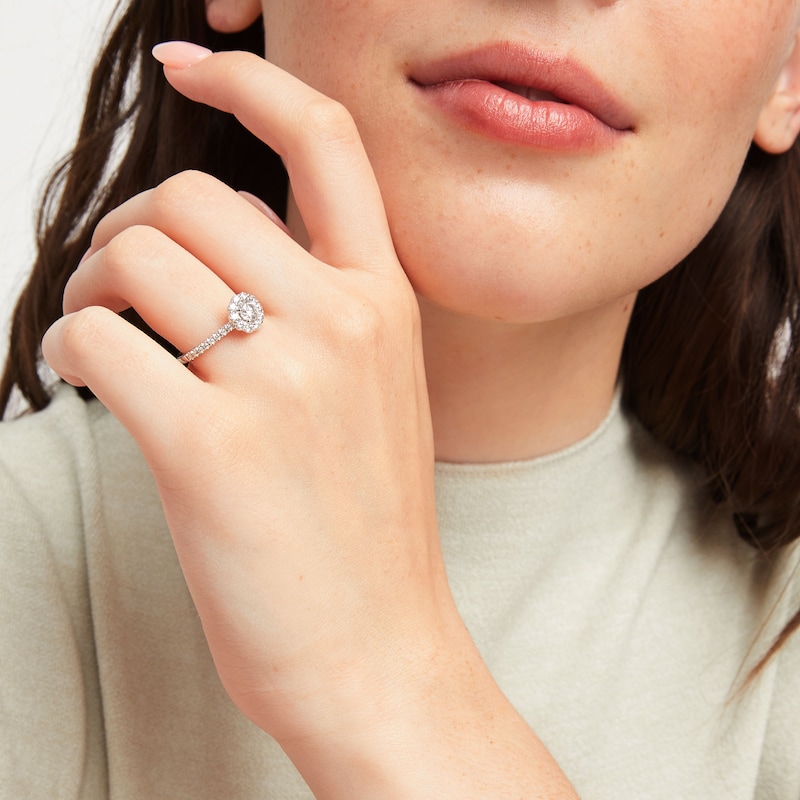 A brilliant 1/2-carat round-cut First Light® diamond sparkles at the center of this beautiful engagement ring for her. From Leo Schachter, the independently-certified diamond features Fire Prism™ technology that creates infinite flashes of color for more fire and sparkle. Beautiful round-cut diamonds frame the center, and more dazzle down each side of the 14K white gold band for a total diamond weight of 1 carat. The center diamond is laser-inscribed with a unique Gemscribe® serial number to ensure your peace of mind. Live Your Love in Color.™