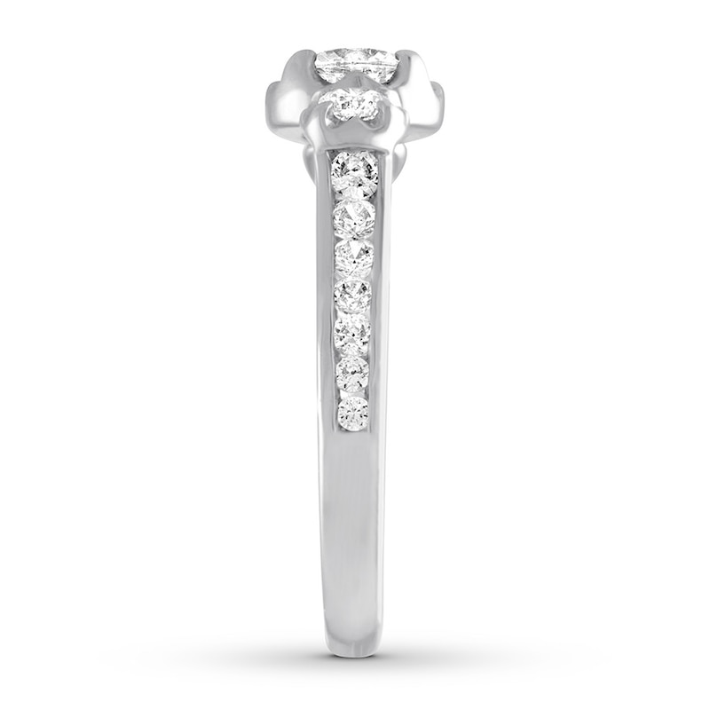 Representing your past, present, and future, this stunning engagement ring features three dazzling round diamonds framed in textured 14K white gold as its focal point. Channel-set diamonds adorn the band to complete the sparkling design, bringing the total diamond weight to 1 1/3 carats. From the Now & Forever® Bridal Collection.