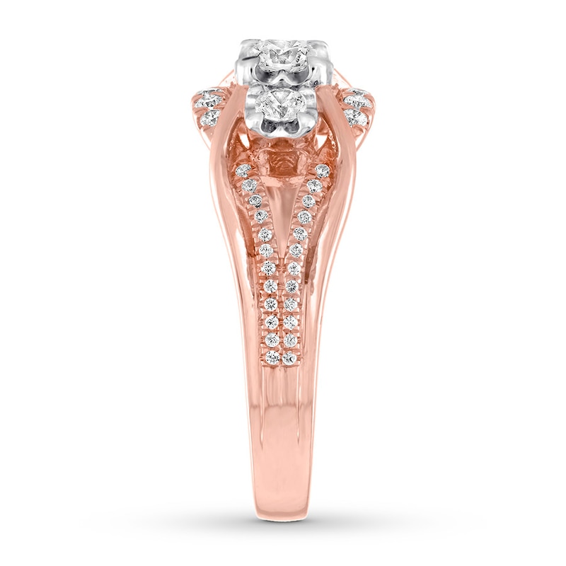 The center of this beautiful engagement ring features three round diamonds set in textured 14K white gold for a larger, more dramatic look. Entwined loops of 14K rose gold and more diamonds create the band, bringing the total diamond weight to 1/2 carat. From the Now & Forever® Bridal Collection.