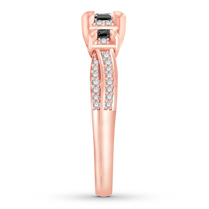 A breathtaking trio of princess-cut black diamonds defines this memorable ring for her. Lines of round white diamonds decorate the band of 10K rose gold for beautiful contrast. The ring has a total diamond weight of 1/2 carat.
