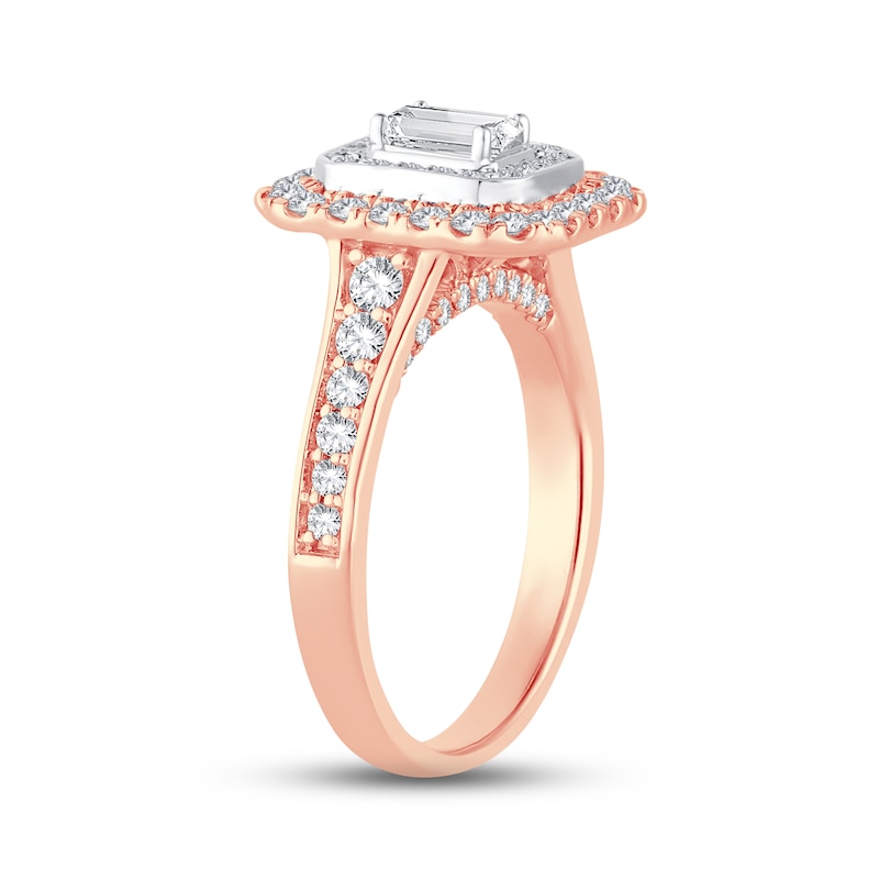 You found "the one" — celebrate your forever love with a beautiful diamond engagement ring! A regal emerald-cut diamond radiates from the center when embraced by two shimmering frames of brilliant round-cut diamonds. The stunning center is perched amidst a classic band traced in more sparkling round diamonds. Styled in 14K rose gold, the ring has a total diamond weight of 1 1/4 carats and is from our Now & Forever® bridal collection.