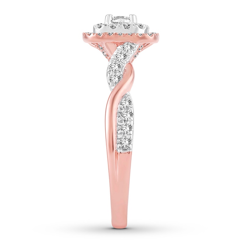 This romantic engagement ring features a princess-cut diamond framed in sparkling round diamonds. More diamonds enliven twists on the band to complete the look. Styled in elegant 10K rose and white gold, the ring has a total diamond weight of 1/2 carat.