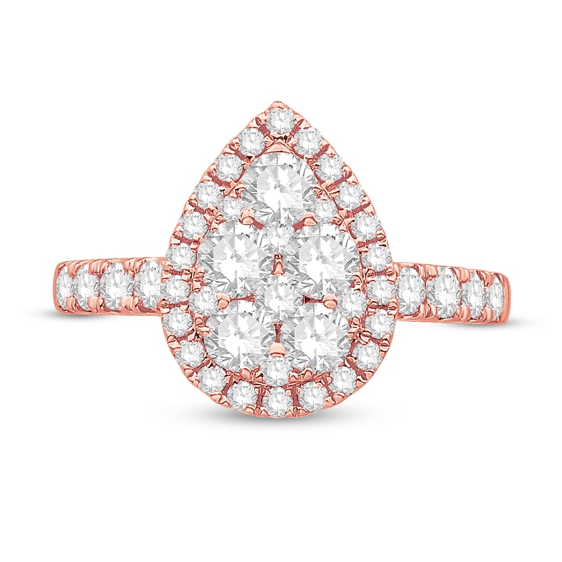 From the Now & Forever® bridal collection comes this exquisite and breathtaking diamond engagement ring for her. Fashioned in pretty 14K rose gold, the ring features a pear-shaped center that has a twinkling halo of round diamonds and holds a brilliant cluster of more round diamonds that shine. Round diamonds are channel-set in the band to complete the look and give the ring a total diamond weight of 1 3/8 carats.