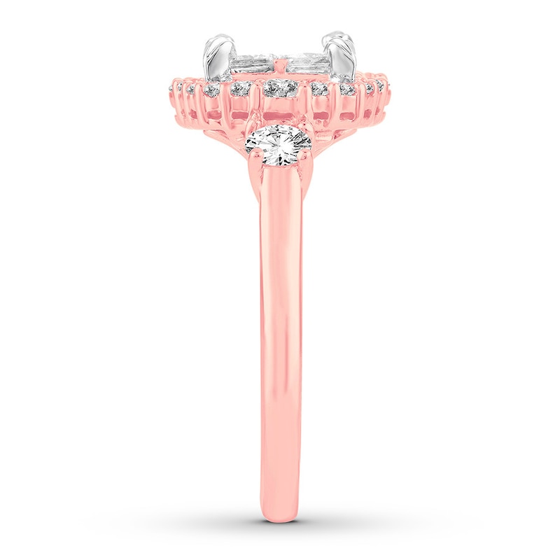 You love each other more than anything, and you're ready to declare your love to the world. Celebrate that next step with this stunning engagement ring. The center displays four sparkling princess-cut diamonds haloed by round diamonds, with an additional round diamond on each side. Accents of 14K white gold complete the look. Styled in classic 14K rose gold, the ring has a total diamond weight of 1 5/8 carats.