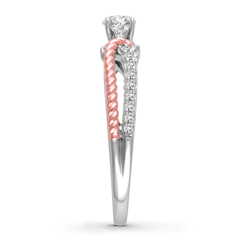 A rope of 10K rose gold intermingles with shimmering diamonds set in the 10K white gold band of this fabulous engagement ring for her. A 1/4-carat diamond twinkles at the center, bringing the total diamond weight to 3/8 carats. From the Now & Forever® Bridal Collection.