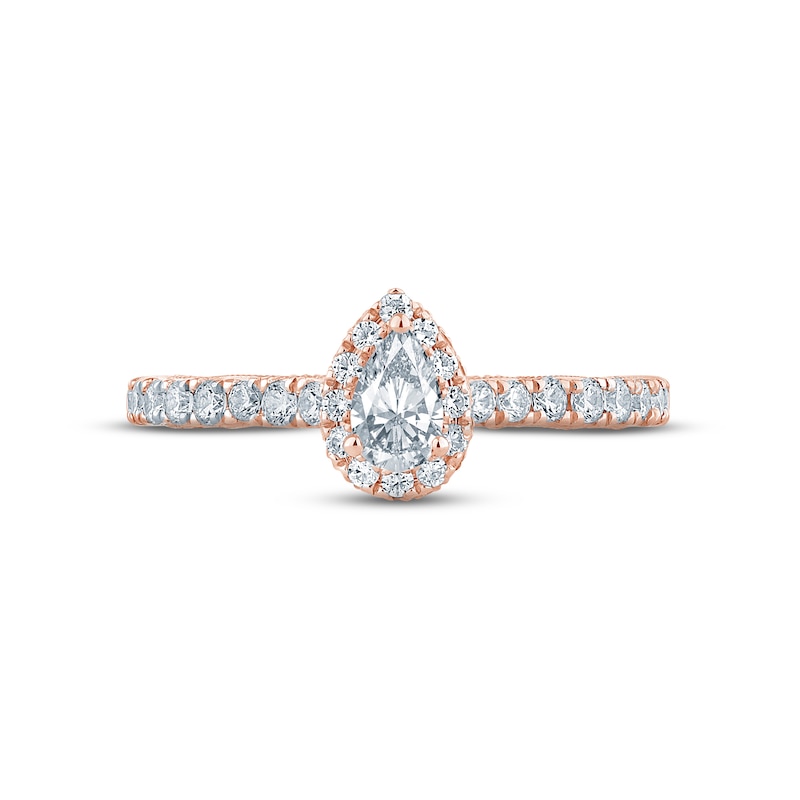 This dreamy and dazzling engagement ring displays a gorgeous 1/3-carat pear-shaped diamond haloed by round diamonds as the stunning centerpiece. More round diamonds adorn the top of the band and sparkle along the side of the band amid twists of milgrain accents. Fashioned in 18K rose gold, the ring has a total diamond weight of 7/8 carat. The independently certified center diamond is laser-inscribed with a unique Gemscribe® serial number to ensure your peace of mind. From the Monique Lhuillier Bliss collection, available exclusively at KAY. Please note: This ring is available in limited sizes. If you don't see your size here, please visit a store to order your ring.