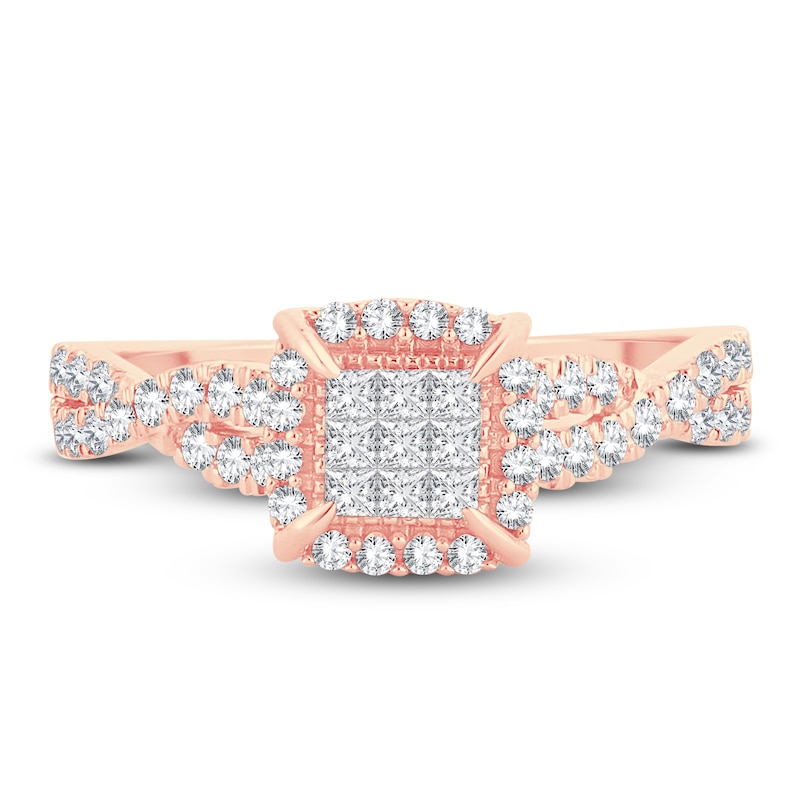 Nine stunning princess-cut diamonds combine for an eye-catching square center design in this composite engagement ring for her. Set in dreamy 14K rose gold, brilliant round diamonds halo the center and and weave down the twisted band for a total diamond weight of 1/2 carat. From the Now & Forever® bridal collection.