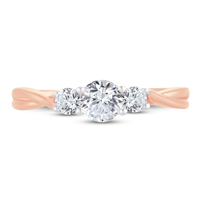 A brilliant 1/2-carat round diamond sparkles at the center, flanked by two round diamonds in this chic 3-stone engagement ring for her. The three diamonds symbolize the past, present and future of your love together. Two bezel-set diamonds shine under the top for extra shimmer. The band is crafted in romantic 14K rose gold and has a total diamond weight of 3/4 carat. From the Now & Forever® bridal collection.