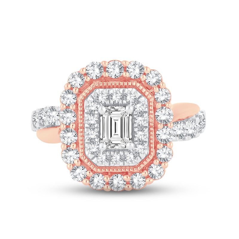 This enchanting engagement ring showcases a sparkling 2/5-carat emerald-cut diamond. A double-halo of radiant round diamonds surrounds the center, and additional round diamonds sweep along the twisting band. Styled in romantic 14K rose gold with a rhodium finish, the ring has a total diamond weight of 1 1/2 carats. From the Now and Forever® bridal collection.