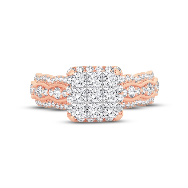 A radiant array of princess-cut diamonds is the focal point of this show-stopping engagement ring for her. Delicate round diamonds trace the square-shaped center and shimmer down the band in three stunning rows. Styled in romantic 14K rose gold, the ring has a total diamond weight of 1 1/2 carats. From the Now and Forever® bridal collection.