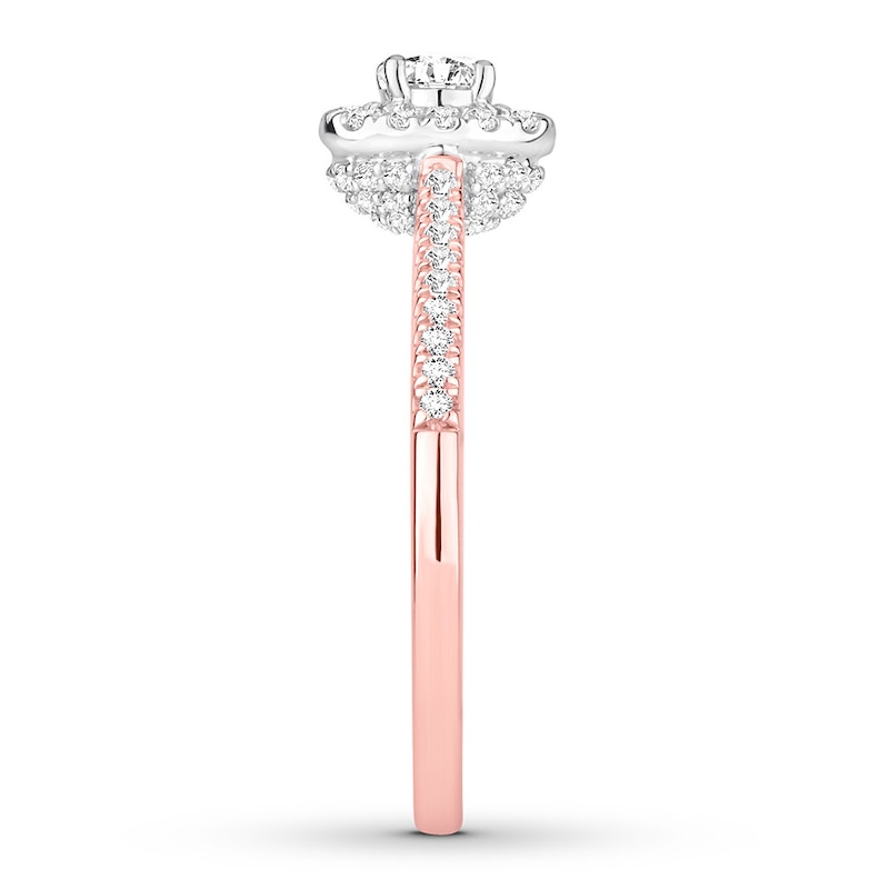 This effortlessly elegant engagement ring features sparkling round diamonds set in 14K white gold to create an elegant halo design in the center. The 14K rose gold band gleams with more diamonds to complement, bringing the total diamond weight to 1/2 carat.