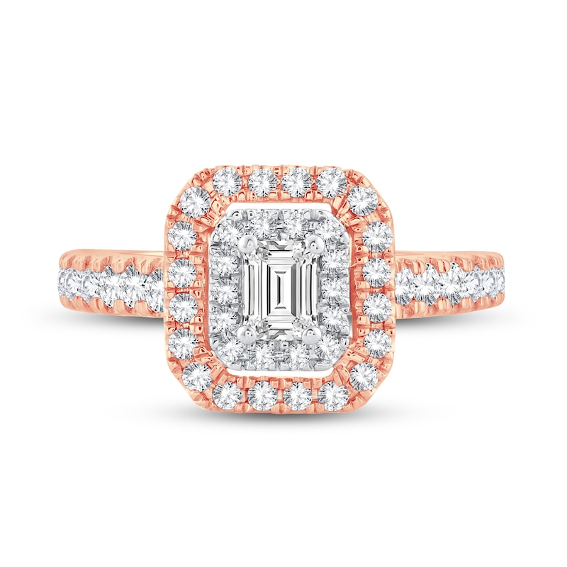 A gorgeous 1/3-carat emerald-cut diamond shines at the center of this luxe engagement ring, haloed by two frames of brilliant round-cut diamonds. More round diamonds sparkle down the sides of the band, and two bezel-set round diamonds shimmer under the head to finish the look. The ring has a total diamond weight of 1 carat and is crafted in dreamy 14K rose gold. From the Now & Forever® bridal collection.