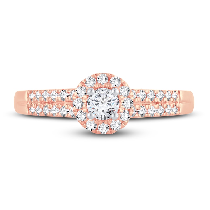 This chic engagement ring shines with a brilliant round diamond at its center, haloed by more round diamonds. The 14K rose gold band sparkles with a sweeping array of round and baguette-cut diamonds, giving the ring a total diamond weight of 3/8 carat. From the Now & Forever® bridal collection.