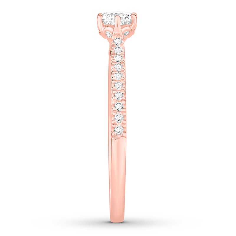 Perfect for someone who loves minimal design and sparkle, this beautiful engagement ring features a sparkling round center diamond accompanied by more diamonds on the band. The ring is styled in 10K rose gold for an elegant look, and the diamonds total 3/8 carat in weight.