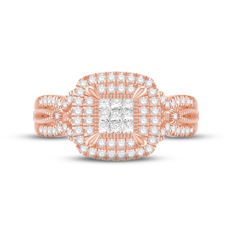 This sensational engagement ring for her showcases an array of princess-cut diamonds framed in two rows of delicate round-cut diamonds. More round diamonds sweep down the romantic 10K rose gold band, bringing the total diamond weight to 5/8 carat. From the Now and Forever® bridal collection.