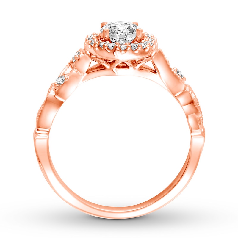 This beautiful engagement ring is a sparkling declaration of your love. A 1/2-carat round diamond is haloed by more diamonds to create the glittering focal point. The floral-inspired band features milgrain flourishes embellished with glistening diamonds and petal-shaped frames. Styled in feminine 14K rose gold, the ring has a total diamond weight of 5/8 carat. From the Now & Forever® Bridal Collection.