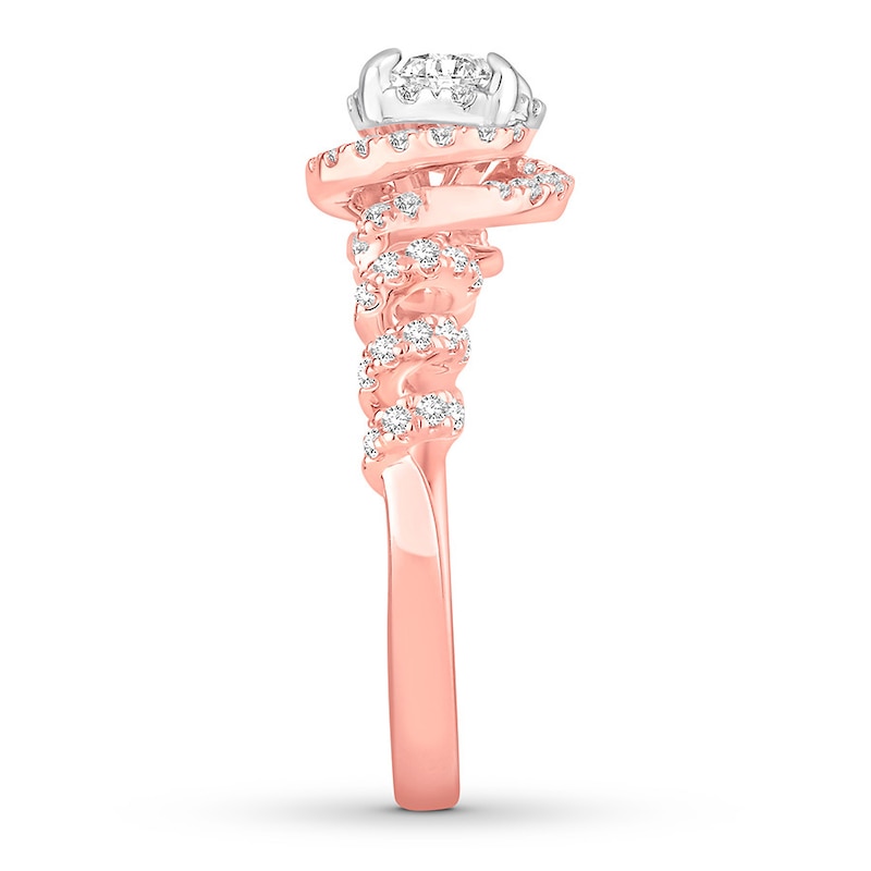 With a unique spiral design on the band, this fabulous engagement ring is all about sparkle and motion. The center features a 1/3-carat round diamond wrapped in diamonds for a dazzling effect. Styled in 14K rose gold, the ring has a total diamond weight of 5/8 carat. The center diamonds are set in 14K white gold.