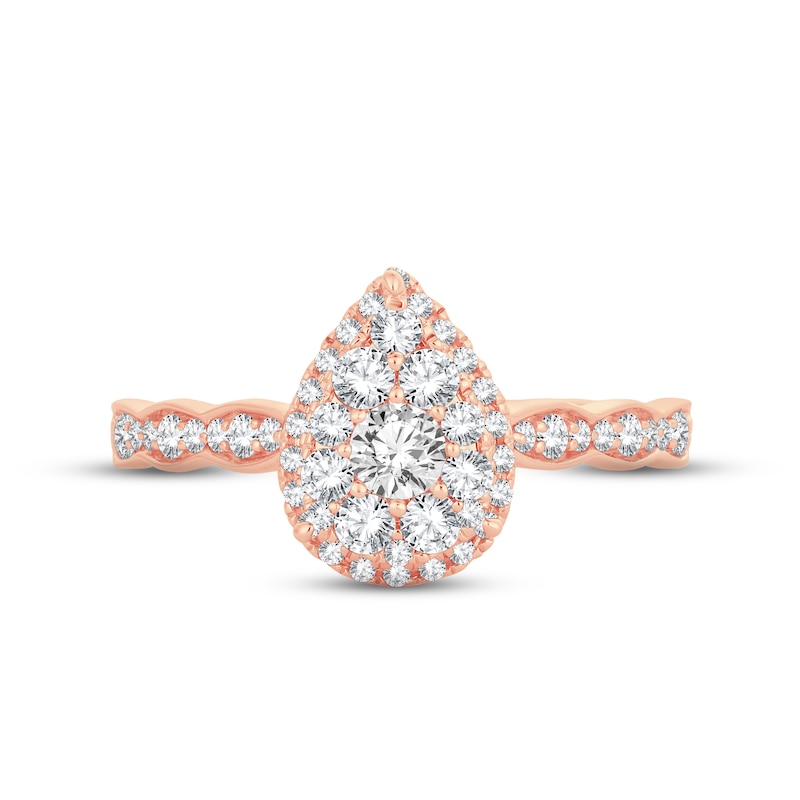 A brilliant round diamond sparkles at the center of this exquisite engagement ring, surrounded by radiant round diamonds that form an elegant pear-shaped design. Additional round diamonds grace the band, which is styled in romantic 14K rose gold. The ring has a total diamond weight of 5/8 carat and is from the Now and Forever® bridal collection.
