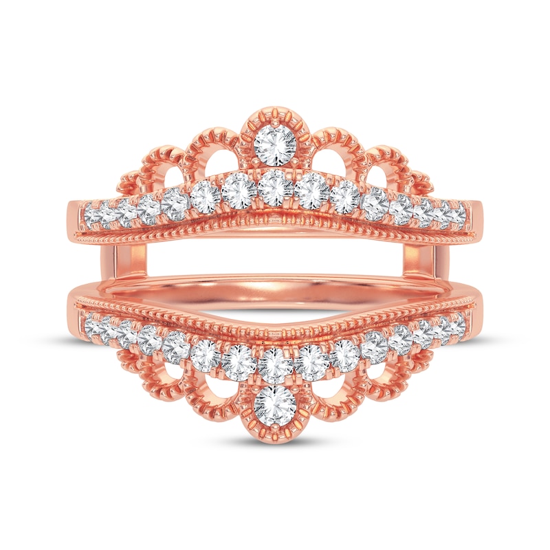 Dress up her engagement ring (sold separately) with this vintage-inspired enhancer ring. The contoured top and bottom bands are lined with dazzling round diamonds. Scallops of milgrain detailing lend heirloom appeal. The ring is styled in 14K rose gold and has a total diamond weight of 3/8 carat. From the Now & Forever® bridal collection.