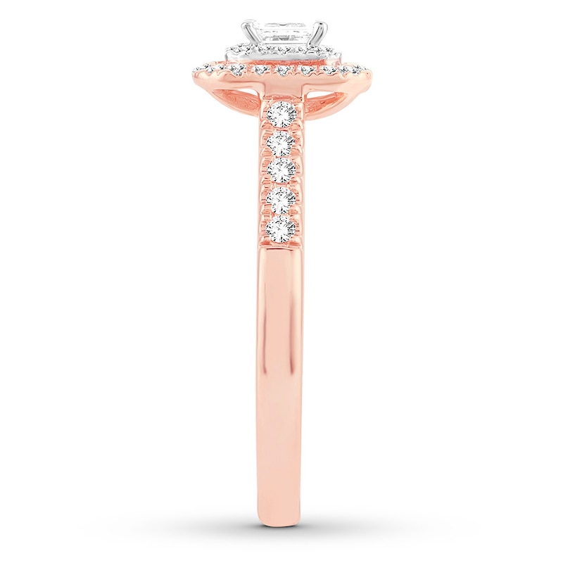 A romantic 14K rose gold band and shimmering round diamonds perfectly accentuate an emerald-cut diamond at the center of this gorgeous engagement ring. The ring has a total diamond weight of 1/2 carat.