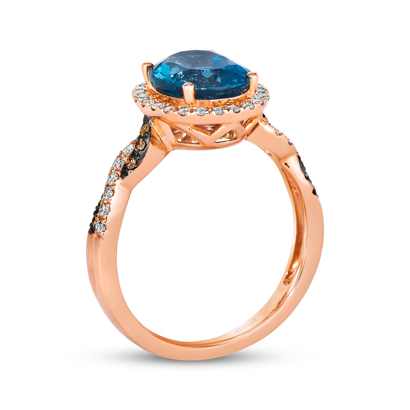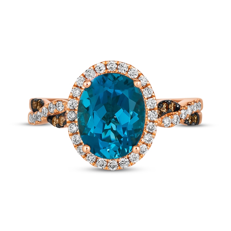 A savory design, this Le Vian® ring from the KAY exclusive Chocolate Twist™ collection is certain to tempt. At its center, an oval-cut Deep Sea Blue Topaz™ is wrapped in a frame of round Nude Diamonds™. The twist shank is lined with round Nude Diamonds™ and round rich Chocolate Diamonds® to complete the presentation. This bold ring is styled in 14K Strawberry Gold® and has a total diamond weight of 1/3 carat. Le Vian®. Discover the Legend. This ring is available in limited sizes. If you don't see your size here, please visit a store to order your ring.