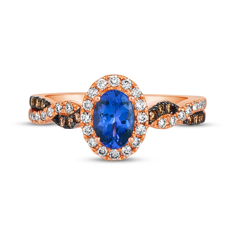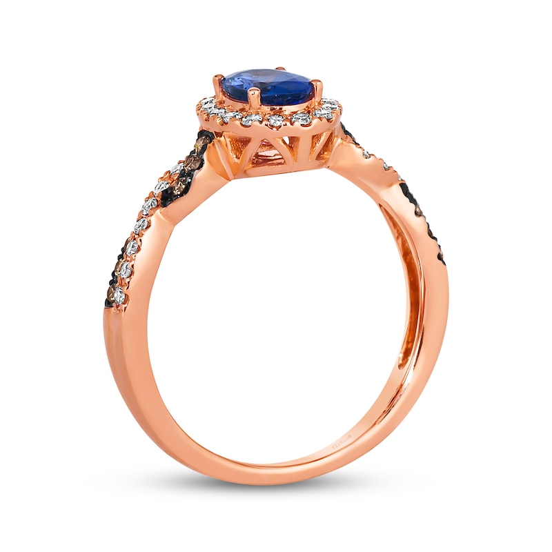 This remarkable Le Vian® ring from the KAY exclusive Chocolate Twist™ collection features a ravishing oval-cut Blueberry Tanzanite® surrounded by sparkling Nude Diamonds™. Radiant ribbons of Chocolate Diamonds® and Nude Diamonds™ interweave down the twisted band for a total diamond weight of 1/3 carat. The ring is crafted in sweet 14K Strawberry Gold®. Le Vian®. Discover the Legend. This ring is available in limited sizes. If you don't see your size here, please visit a store to order your ring.