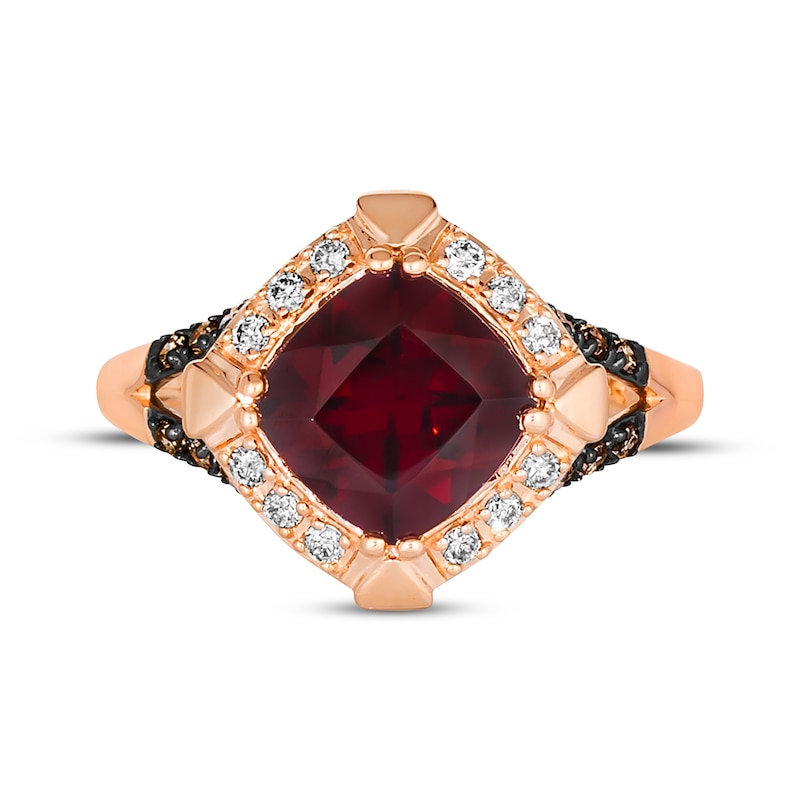 A tempting cushion-cut Pomegranate Garnet™ is the irresistible center of attention on this Le Vian Creme Brulee® ring. Dazzling Nude Diamonds™ frame the center, while Chocolate Diamonds® add rich contrast to the split shank. Crafted in sweet 14K Strawberry Gold®, the ring has a total diamond weight of 1/4 carat. Le Vian®. Discover the Legend. This ring is available in limited sizes. If you don't see your size here, please visit a store to order your ring.