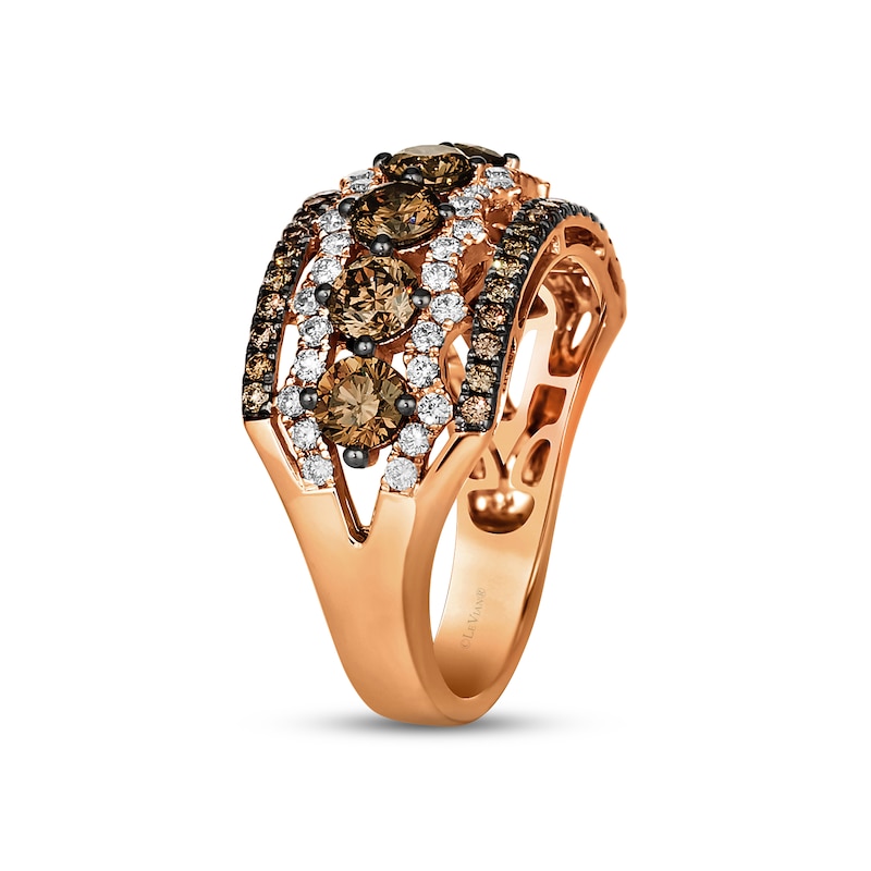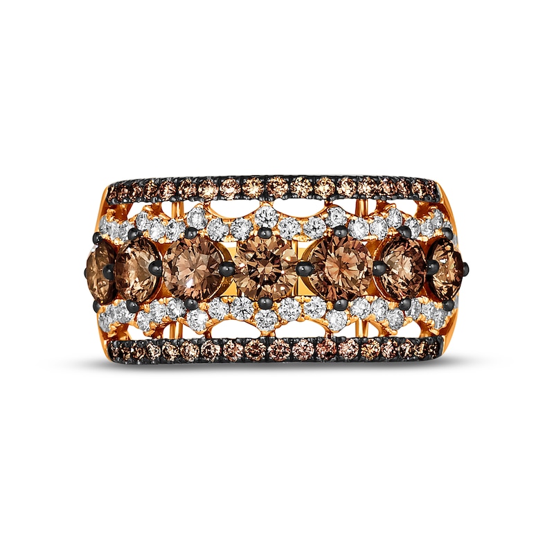 This irresistible ring from Le Vian® showcases a center row of lavish Chocolate Diamonds® traced by scalloped rows of frosty Vanilla Diamonds®. More rich Chocolate Diamonds® line the top and bottom edges of the band, which is styled in luscious 14K Strawberry Gold®. The ring has a total diamond weight of 1 7/8 carats. Le Vian®. Discover the Legend. This ring is available in limited sizes. If you don't see your size here, please visit a store to order your ring.