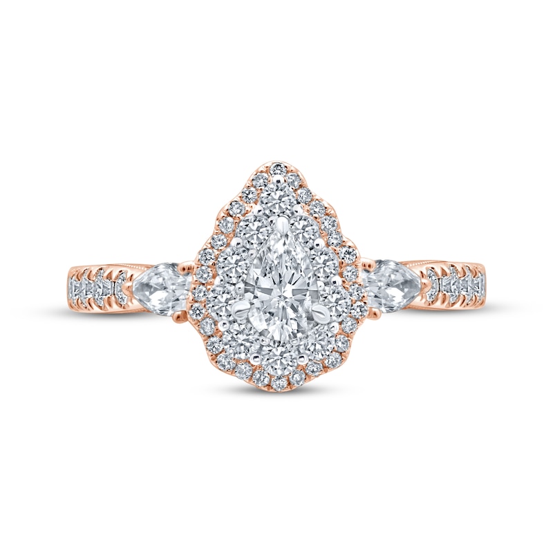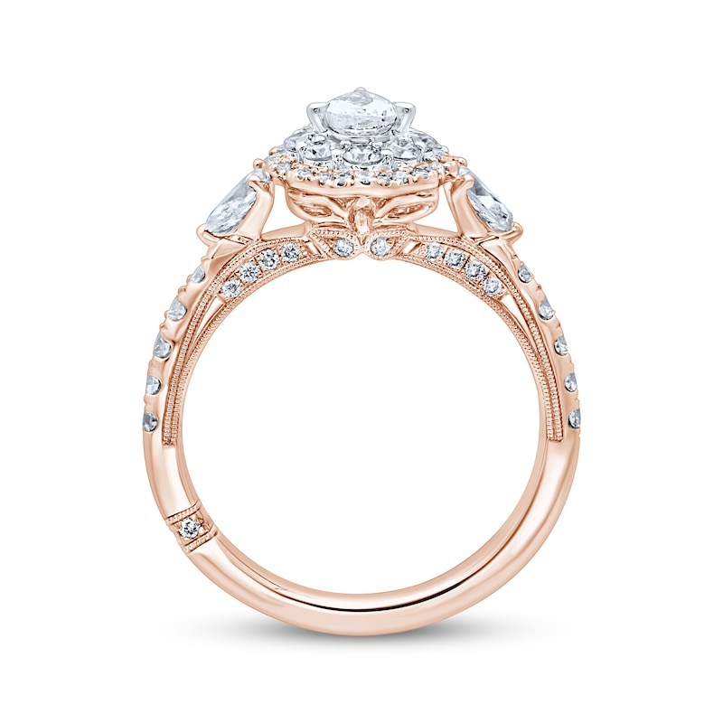 A beautiful independently-certified pear-shaped diamond sparkles at the center of this mesmerizing engagement ring. Brilliant round diamonds halo the center diamond and shine in 18K white gold settings. Another frame of round diamonds surround the halo in complementary 18K rose gold. Pear-shaped diamonds flank each side of the center design, and more round diamonds shimmer down the 18K rose gold band for a total diamond weight of 1 1/4 carats. Classic milgrain detailing finishes the look. From the Monique Lhuillier Bliss collection, available exclusively at KAY. Please note: This ring is available in limited sizes. If you don't see your size here, please visit a store to order your ring.