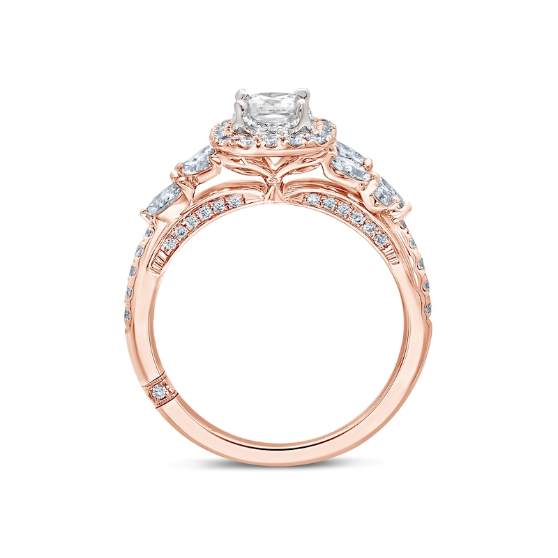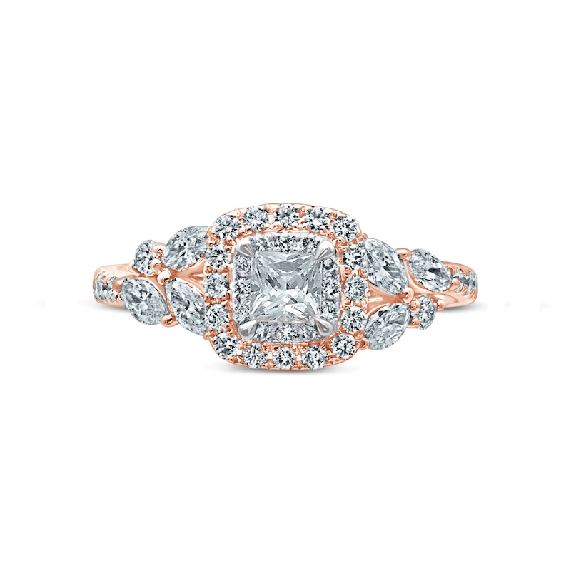 A beautiful 3/8-carat independently-certified princess-cut diamond shines at the center of this chic engagement ring. Brilliant round diamonds halo the 18K white gold center setting, and another halo gleams in 18K rose gold. A gorgeous array of marquise- and round-cut diamonds sparkle along each side, and more round diamonds line the band for a total diamond weight of 1 1/6 carats. From the Monique Lhuillier Bliss collection, available exclusively at KAY. Please note: This ring is available in limited sizes. If you don't see your size here, please visit a store to order your ring.