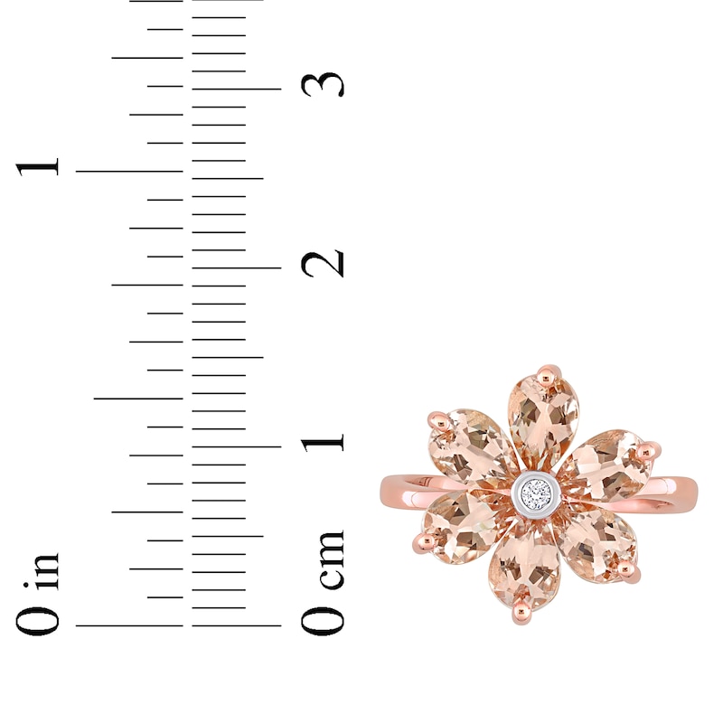 This blushing ring displays an array of peachy pink, pear-shaped morganites arranged to resemble flower petals. A bezel-set diamond accent glimmers at the center for a touch of sparkle. The ring is crafted in pretty 10K rose gold.