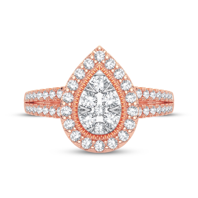 Give your love the radiant sparkle of this romantic 10K rose gold engagement ring. An array of bright round diamonds adorns the pear-shaped center, styled in white rhodium for a beautiful two-tone look. Milgrain accents and more diamonds surround the center, while additional diamonds dance down the split shank. The ring has a total diamond weight of 3/8 carat and is from our Now & Forever® bridal collection.