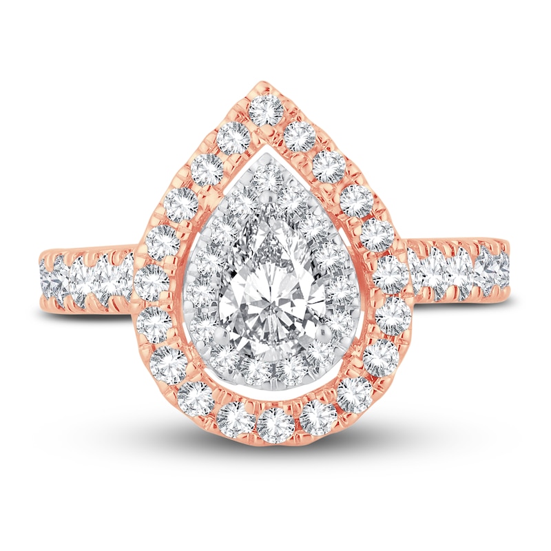 They'll be swept away (and say YES!) with the breathtaking sparkle of this diamond engagement ring. An exquisite pear-shaped diamond forms a remarkable focal point when embraced with duo halos of shimmering round-cut diamonds. For a delightful finish, extra round diamonds adorn the polished 14K rose gold band. The ring has a total diamond weight of 1 1/2 carats and is from our Now & Forever® bridal collection.