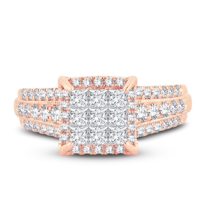 Nine stunning princess-cut diamonds form a spellbinding square center design in this gorgeous composite engagement ring. Set in dreamy 14K rose gold, the center is framed by brilliant round diamonds, and multiple rows of round diamonds sparkle down the sides of the band for a total diamond weight of 1 carat. From the Now & Forever® bridal collection.