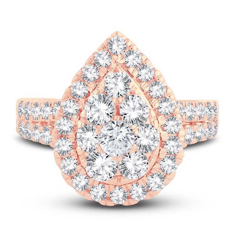 A gorgeous cluster of round diamonds sparkles at the center of this teardrop-shaped engagement ring. Set in dreamy 14K rose gold, brilliant round diamonds halo the center and sparkle down the band in dual rows. The ring has a total diamond weight of 2 carats. From the Now & Forever® bridal collection.