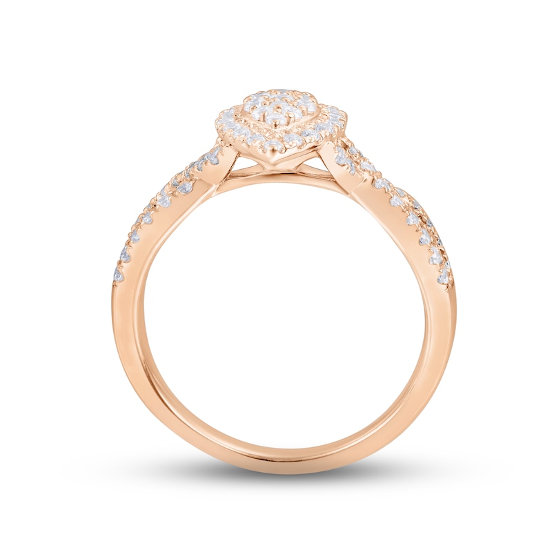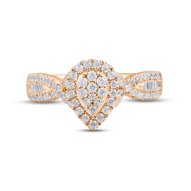 Radiant round-cut diamonds comprise the beautiful pear-shaped center of this gorgeous enegagement ring for her. More round diamonds grace the elegantly twisted band, framing a channel-set row of sparkling baguette-cut diamonds. Crafted in romantic 14K rose gold, the ring has a total diamond weight of 5/8 carat. From the Now & Forever® bridal collection.