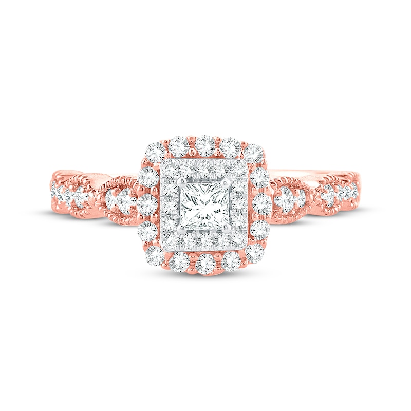 Express your love with this vintage-inspired engagement ring. A shimmering princess-cut diamond is the star of the design, surrounded by squared frames of round-cut diamonds. The scalloped shank is edged with milgrain details and lined with round diamonds, lending heirloom charm. More round diamonds along the gallery create sparkle from every angle. Crafted in 10K rose gold with white rhodium detail, this ring has a total diamond weight of 1/2 carat. From the Now & Forever® bridal collection.