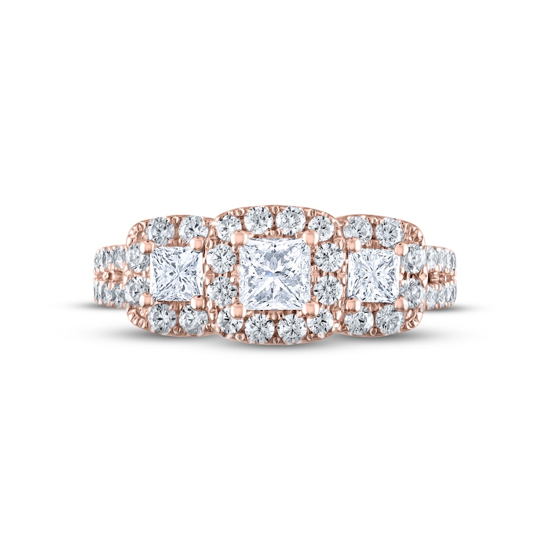 Three stunning princess-cut diamonds sparkle at the center of this exquisite THE LEO Diamond® engagement ring. Each center diamond features a halo of brilliant round-cut diamonds, and more round-cut diamonds dazzle down each side of the 14K rose gold band, giving the ring a total diamond weight of 1 1/3 carats. The independently certified center diamond is laser-inscribed with a unique Gemscribe® serial number to ensure your peace of mind.