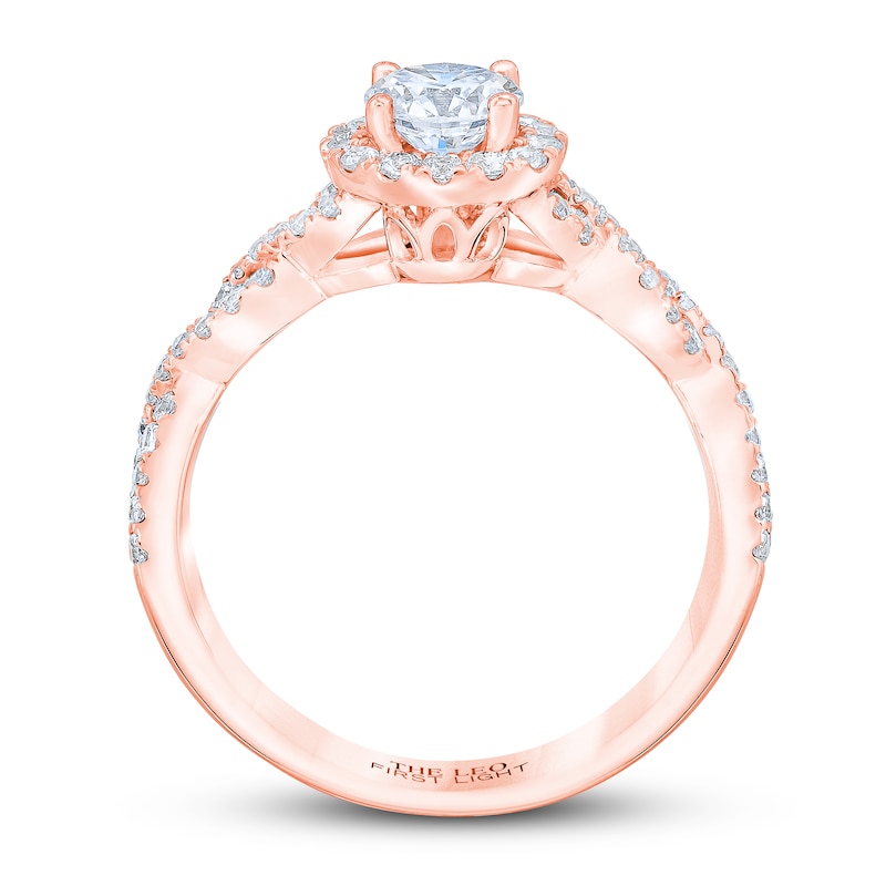 A stunning round-cut 1/2-carat First Light® diamond sparkles at the center of this radiant engagement ring for her. From Leo Schachter, the center diamond features Fire Prism™ technology, creating infinite flashes of color for more fire and sparkle. Brilliant round-cut diamonds halo the center and weave down the 14K rose gold band for a total diamond weight of 7/8 carat. The diamonds are independently certified, and the center diamond is laser-inscribed with a unique Gemscribe® serial number to ensure your peace of mind. Live Your Love in Color.™