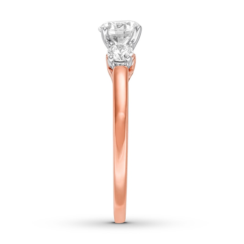 This stunning 3-stone engagement ring features a 1-carat round diamond center nestled by a round diamond on either side set in 14K white gold. The band romantically styled in 14K rose gold, the ring has a total diamond weight of 1 1/3 carats.