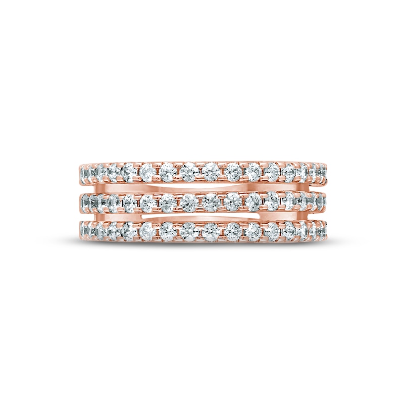 Three rows of scintillating round diamonds give this gorgeous anniversary ring a chic stacked look. The ring is crafted in 14K rose gold and has a total diamond weight of 3/4 carat. From the Now and Forever® bridal collection.