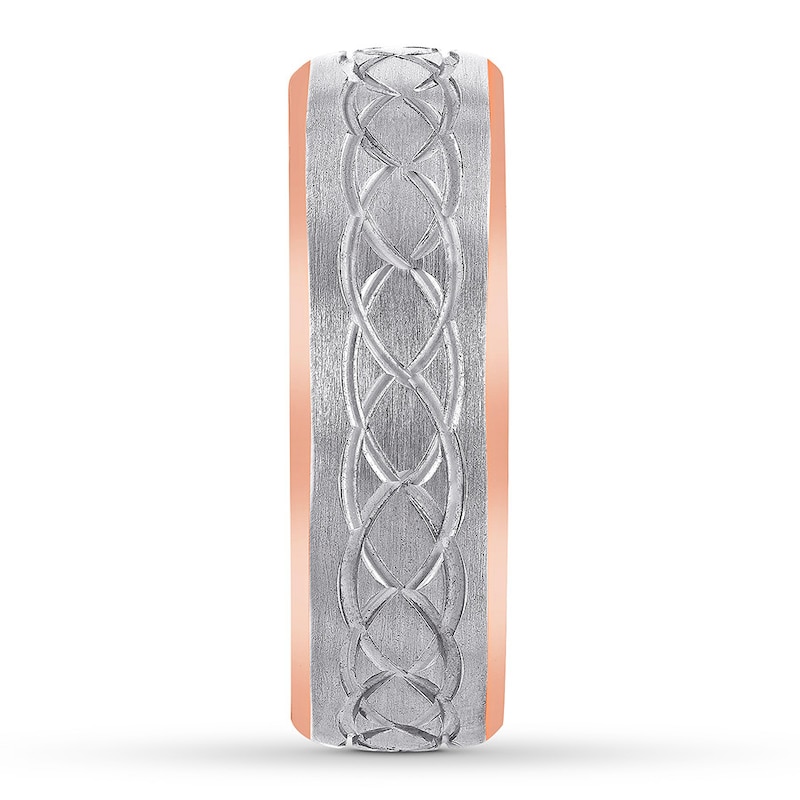 The 14K white gold center of this distinguished wedding band features an engraving of entwined curves. The inside of the 6mm band is crafted of 14K rose gold. Available in sizes for men and women, the ring is Supreme-Fit™ for maximum comfort.