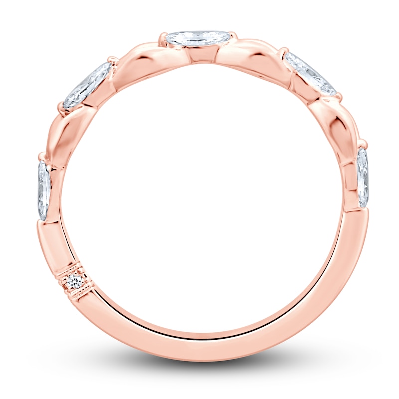 This elegant anniversary band showcases sweeps of dreamy 18K rose gold and beautiful independently-certified marquise-cut diamonds. Lovely round diamond accents sparkle along the side, finishing the look. The ring has a total diamond weight of 1/2 carat. From the Monique Lhuillier Bliss collection, available exclusively at KAY. Please note: This ring is available in limited sizes. If you don't see your size here, please visit a store to order your ring.